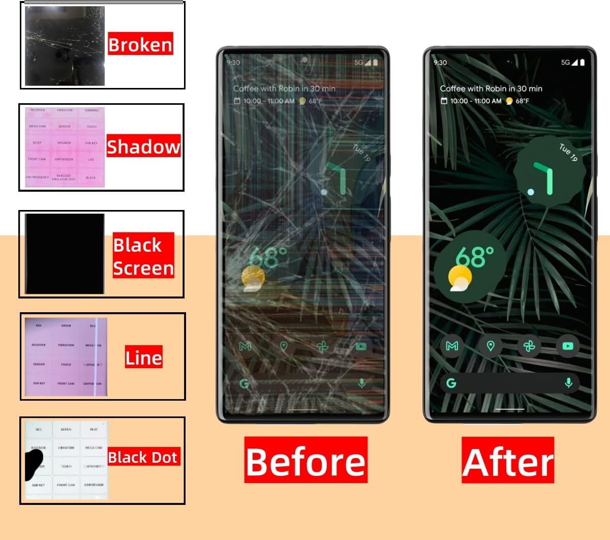 Immerse yourself in vibrant visuals with the Pixel 6 Pro LCD Screen! Our LCD screen replacement for Google Pixel 6 Pro includes a new Oled screen, providing vibrant visuals and an optimal viewing experience.Support LCD fingerprint technology and 60HZ refresh rate on a 6.7-inch display, our screen replacement will take your smartphone experience to the next level. This replacement screen for Google Pixel 6 Pro:GLUOG G8VOU.So, you can enjoy a seamless fit and functionality. Designed to address a host of display issues, our for Google Pixel 6 Pro LCD screen replacement kit is your solution for cracked, damaged screens, touch issues, dead pixels, and color problems. We also provide a comprehensive installation kit for easy screen replacement. The kit includes a pre-assembled frame/bezel, back cover adhesive, and battery adhesive. Plus, all our screens are rigorously tested before shipping, so you can buy with confidence. Experience the high-quality visuals and seamless smartphone operation for Google Pixel 6Pro screen replacement today! Important 1.This is New OLED Screen replacement for Google Pixel 6 Pro,support fingerprint . 2.This screen only fit for Google Pixel 6 Pro All Version. 3.This Pixel 6 Pro LCD screen used to replace old brocken screen. 4.This screen for Google Pixel 6 Pro screen frame is pre-assembled,you don’t need to remove the old frame. 5.This Pixel 6 Pro screen replacement includes a professional full set of repair tools. Package Included: LCD screen replacement for Google Pixel 6 Prox 1 Back cover adhesive x1 SIM eject pin x1 Screwdriver +2.0 x1 Screwdriver +1.5 x1 Screwdriver -2.0 x1 Nylon plastic spudger opening tool pry bar x1 Triangle metal pry pieces openers x1 Suction cup x1 Tweezers x1 Clean Alcohol Wipe x1 Rubber band x6 After-Sales Service We provide 24 hours quick reply,If you are not 100% satisfied with our product ,please fell free to contact us via Amazon and will be our pleasure to serve you.